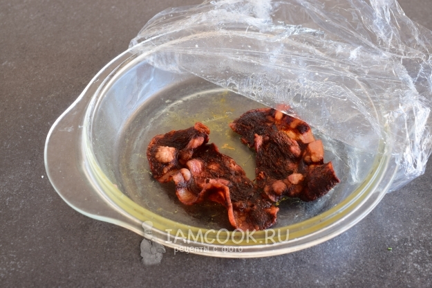 Прежде всего обжарить полоски бекона либо на сухой сковороде до хрустящего состояния, либо как я, поместив полоски бекона в посуду для микроволновой печи и накрыв ее пленкой. Готовить бекон в микроволновой печи 1-1,5 минуты при 600 Вт. Дать бекону остыть.