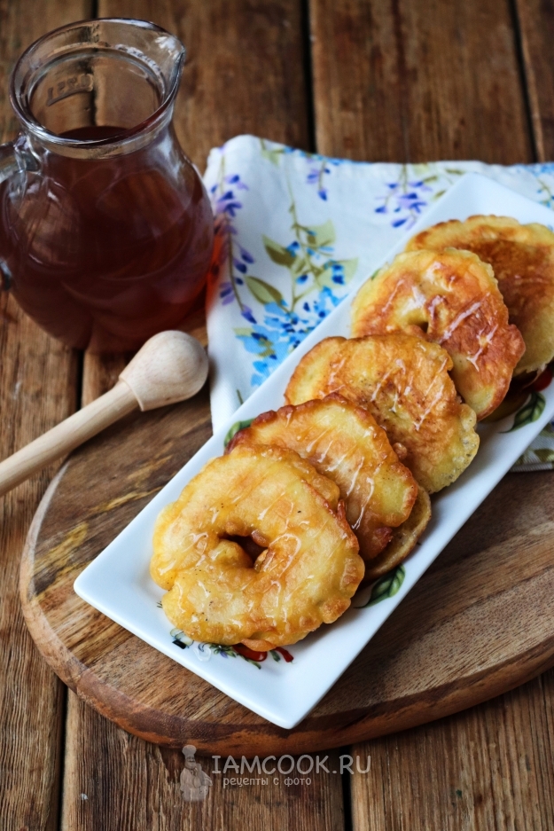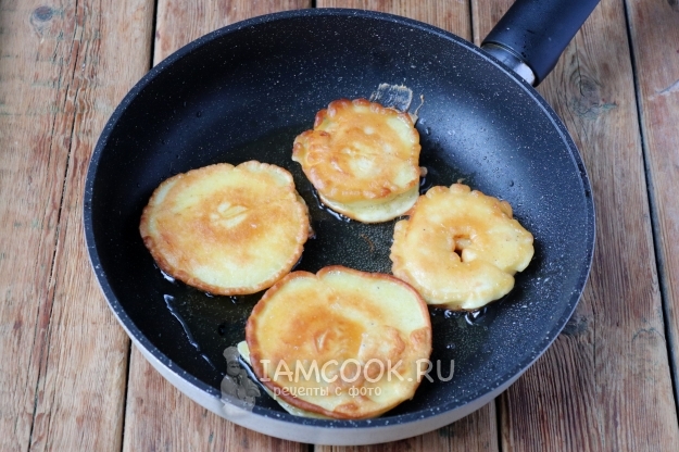 Сковороду отправьте на огонь, налейте растительное масло и подождите, пока оно хорошо не разогреется. Колечки из яблок окуните в кляр и выложите на сковороду. Сделайте огонь ниже среднего и обжарьте кольца до золотистого цвета с двух сторон. Затем переложите их на бумажное полотенце, чтобы избавиться от лишнего масла.