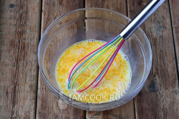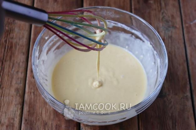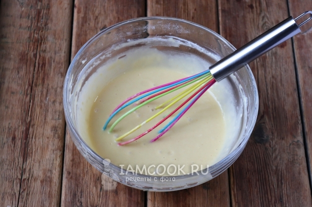 В молочно-яичную смесь всыпьте просеянную муку и разрыхлитель. Размешивая венчиком, соедините ингредиенты между собой.