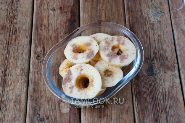Яблоки помойте под проточной водой, обсушите и очистите от кожуры. Вырежьте сердцевину, для удобства можно воспользоваться специальным приспособлением. Фруктовую мякоть нарежьте колечками (как на фото) и присыпьте молотой корицей.