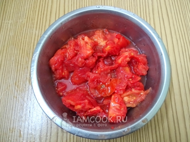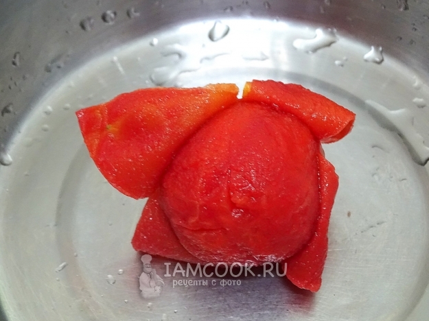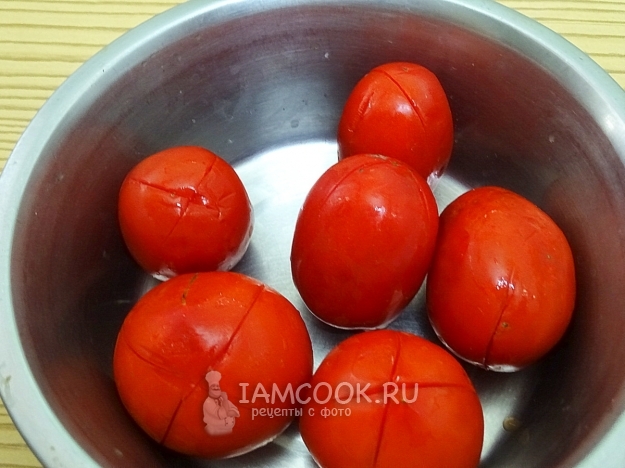 У помидоров надрезаем крест-накрест кожицу и отправляем в кипящую воду на 2 минуты, а потом сразу под холодную воду.