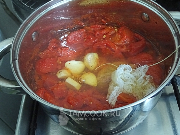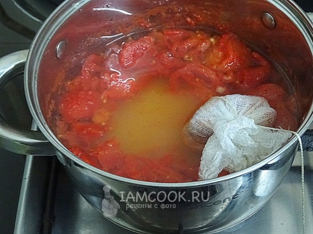 В кастрюлю с толстым дном помещаем помидоры, сахар, уксус, соль и перец. В томатную массу опускаем мешочек со специями, нитку оставляем снаружи.