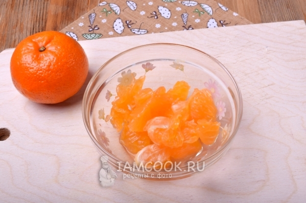 Самая долгая процедура - это очистить мандарины. Нам нужна мякоть мандаринов, поэтому очистив мандарины от кожуры, нужно удалить все белые пленки, перегородки и волокна - в общем, все, что скрывает вкуснейшую мякоть фруктов. Если у мандаринов есть косточки, удаляем и их.