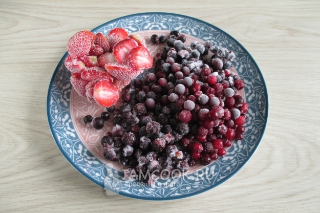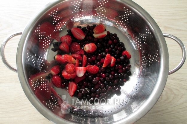 Состав ягод может быть практически любым: крупные, мелкие, садовые, лесные, кислые, сладкие, терпкие... Для показываемого варианта были взяты из морозилки клубника, ирга, черная смородина, немного черемухи и клюква.
