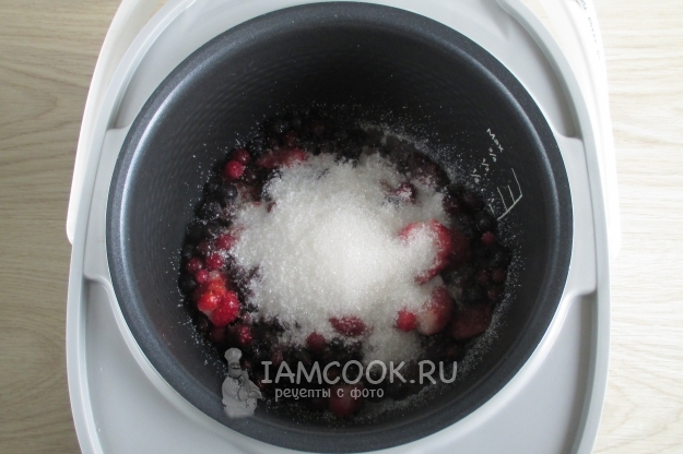 Установите режим "тушение 1 час". Начните варку при помешивании, сначала ягоды оттают и дадут сок, потом сахар в нем растворится. Когда начнется ровное слабенькое кипение - тушение, то можно будет уже помешивать не постоянно, а периодически. Прекратите варку и отключите мультиварку, когда варенье достигнет нужной густоты. Для средней густоты потребуется 30-45 минут, для очень густого - ждите один час.