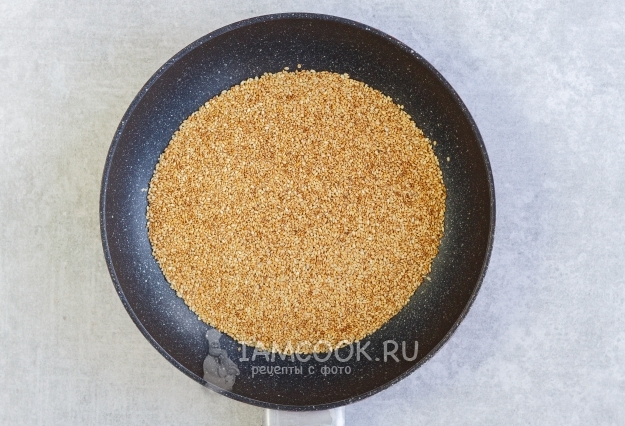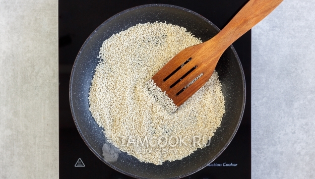 Отмерьте семена кунжута в чистую сухую сковороду и, постоянно помешивая, на среднем огне обжарьте 4-5 минут, до золотистого цвета. Только не пытайтесь сэкономить эти 5 минут, купив уже готовый жареный кунжут – это совсем не «то же самое по вкусу», поверьте.