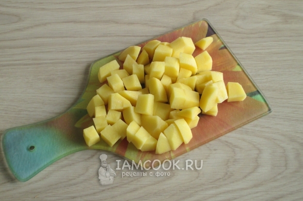 Влейте в чашу мультиварки бульон от варки фрикаделек и когда он закипит, добавьте картофель, нарезанный кубиком.