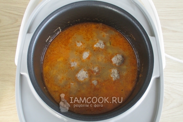 После звукового сигнала суп готов, попробуйте его и досолите по вкусу, добавьте сванскую соль или давленый чеснок. Верните в суп фрикадельки и дайте ему минут пять настояться.