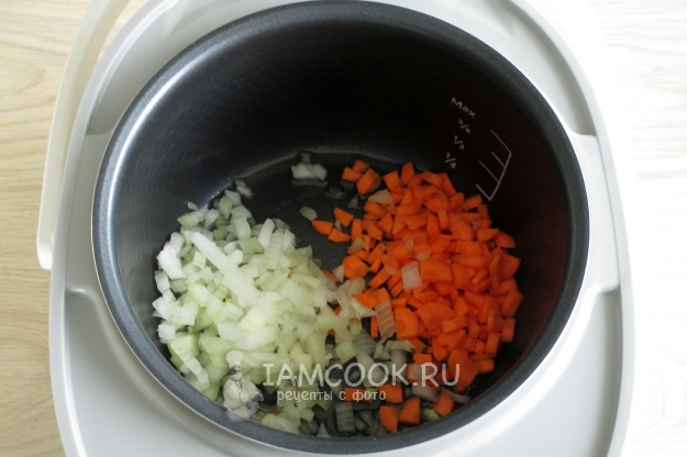В чашу мультиварки налейте растительное масло и отправьте мелко нашинкованные лук и морковь, слегка посолите. Установите режим "тушение 1 час". Сначала мультиварка разогреется минут на десять практически до режима жарка и эти овощи хорошо подрумянятся. Пару раз помешайте их.