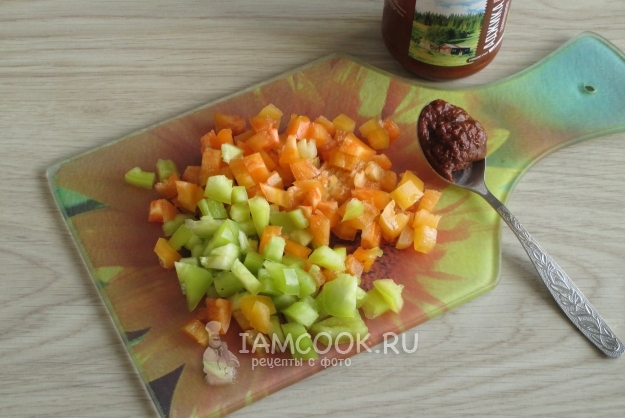 Следом отправьте кабачок и перец, нарезанные кубиком. Добавьте ложечку соуса аджика.