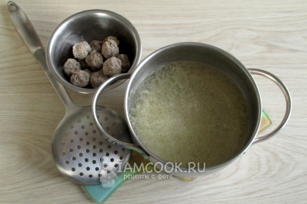 Первым делом сварите эти фрикадельки. Для этого забросьте их в кипящую воду и варите после всплывания около пяти минут. Затем фрикадельки нужно выловить и отложить, а полученный насыщенный бульон использовать для супа. Фрикадельки от длительной варки становятся более жесткими или менее сочными. Раньше не задумывалась, но попробовав раз, теперь стараюсь их вовремя выловить.