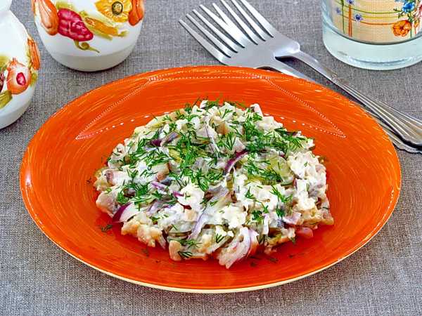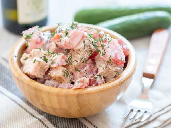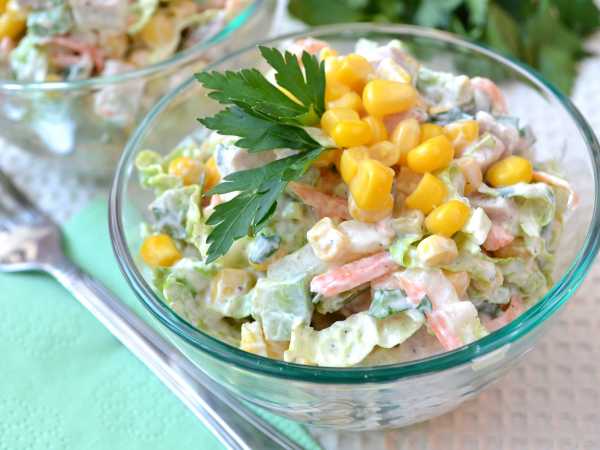 Полить салат заправкой и перемешать все ингредиенты.