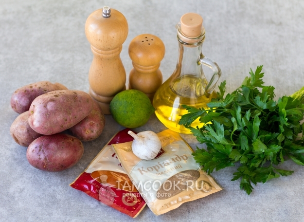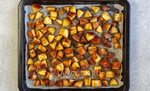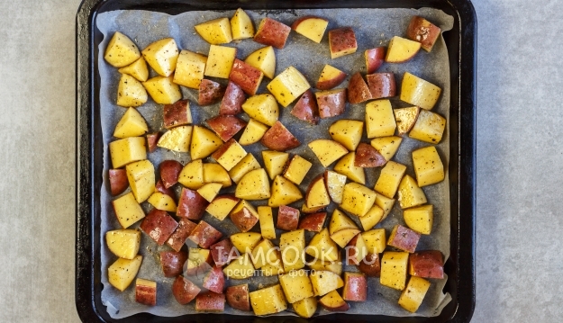 Выложите картофель на застеленный пекарской (пергаментной) бумагой противень и равномерно распределите. Поместите противень с картофелем в разогретую до 200 градусов духовку и выпекайте до готовности, примерно 40 минут.