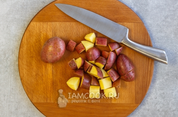Хорошо промытый картофель нарежьте небольшими кубиками. Картофель лучше брать такого сорта, который больше подходит для жарки.