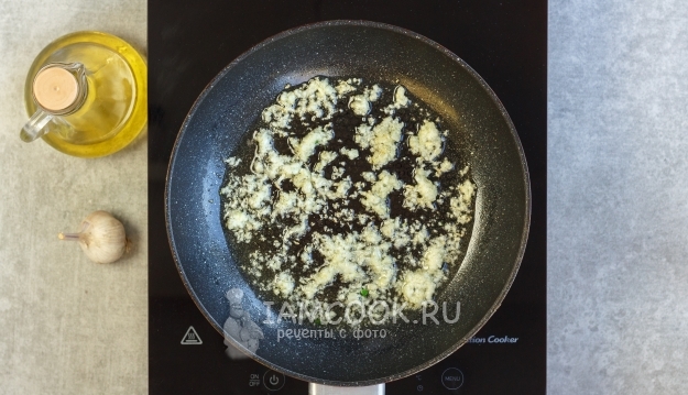 Приготовьте пряную заправку для картофеля. Поскольку готовится заправка очень быстро, то ее лучше готовить тогда, когда картофель уже готов. Разогрейте сковороду на среднем огне и влейте 1-2 ст.л. оливкового масла. Добавьте мелко нарезанный чеснок и, помешивая, обжарьте его 30 секунд, до золотистого цвета (огонь можно немного уменьшить).