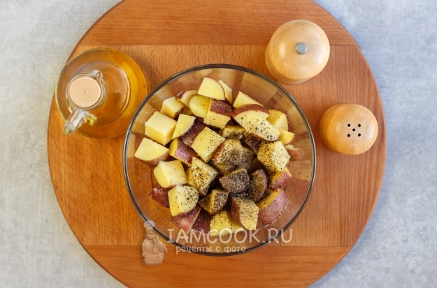 Переложите нарезанный картофель в глубокую емкость. Добавьте 1-2 ст.л. оливкового масла, соль и черный молотый перец по вкусу. Хорошо все перемешайте.