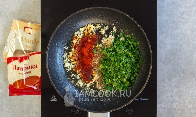 Затем добавьте в сковороду молотую паприку, молотый кориандр и мелко нарезанную свежую петрушку/кориандр. Помешивая, обжарьте все еще 1 минуту на небольшом огне.