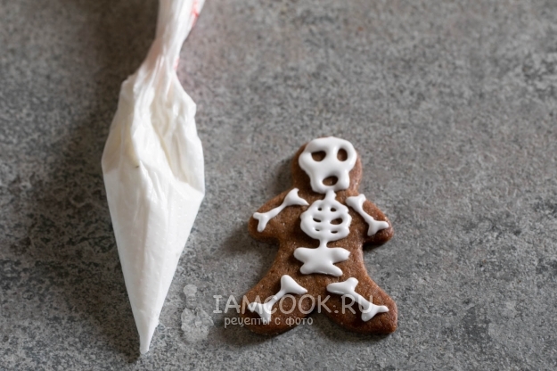 Помещаем глазурь в рассадочный мешочек, срезаем у него кончик буквально на 1 миллиметр, а потом рисуем скелетиков на пряниках.