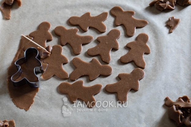 Вырезаем формочками пряничных человечков. Обрезки теста скатываем в ком по новой, слегка остужаем в холодильнике - и их можно так же раскатывать и раскатывать повторно, пока тесто не будет израсходовано полностью.