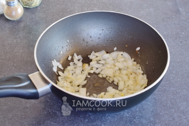 В сковороде разогреть оливковое масло и обжарить на нем лук до прозрачности.