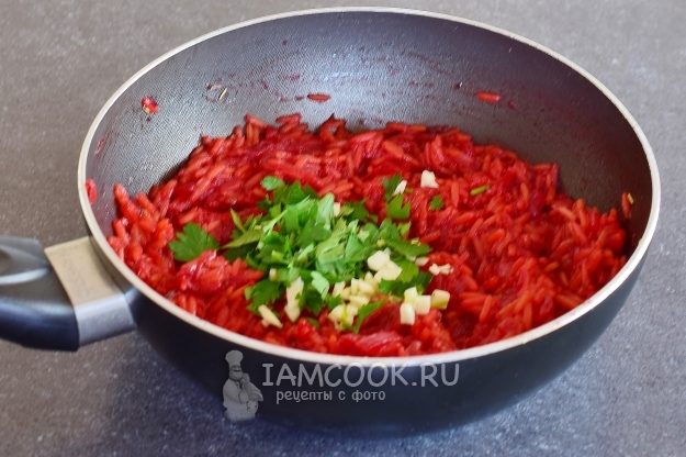 Выложить натертую свеклу к луку, обжарить овощи 5-7 минут, помешивая.