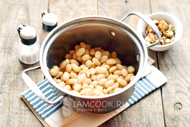 За 10 минут до готовности киньте в воду соль (если это сделать раньше, тогда зерна могут стать твердыми). Фасоль должна быть максимально мягкой, можно даже разваристой, чтобы было легко перебить ее в пасту. После варки воду слейте в отдельную емкость, она может еще понадобиться.