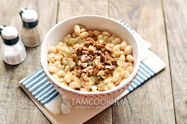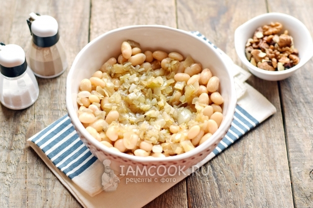 Луковые и чесночные кусочки слегка обжарьте на масляной сковороде до прозрачности и легкой золотистости, затем вместе с маслом перекиньте пассеровку в отварную фасоль. Фасоль при этом должна оставаться теплой.