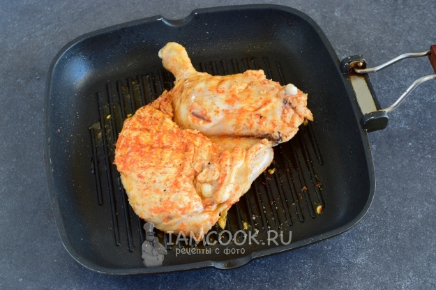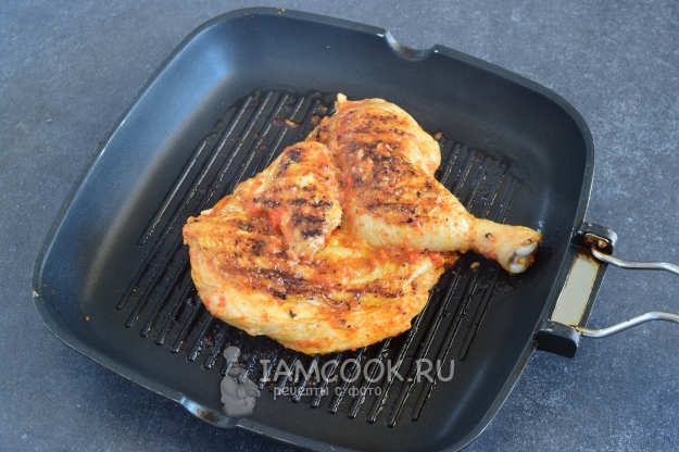 Сковороду-гриль поставить на огонь и разогреть, обжаривать половинку курицы с одной стороны 4-5 минут.