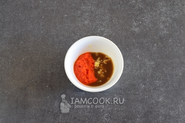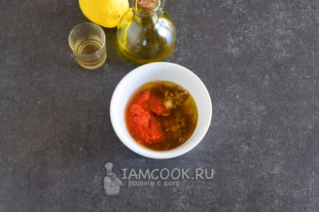 В небольшой пиалке приготовить маринад: выложить пюре из болгарского перца, добавить пропущенный через пресс чеснок, влить соус пири-пири.
