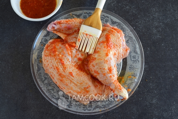 Кисточкой обмазать со всех сторон половинку тушки курицы маринадом, накрыть миску с курицей в маринаде пищевой пленкой, отправить в холодильник и оставить ее там мариноваться на 2 часа.