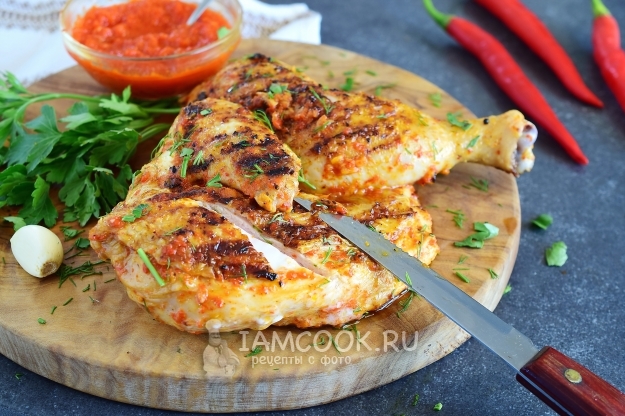Каждый раз, пока жарится одна сторона курицы, верх ее смазывать оставшимся маринадом. Затем еще раз перевернуть мясо, жарить его 4-5 минут на одной стороне, смазать верх курицы маринадом и затем жарить ее столько же на другой.