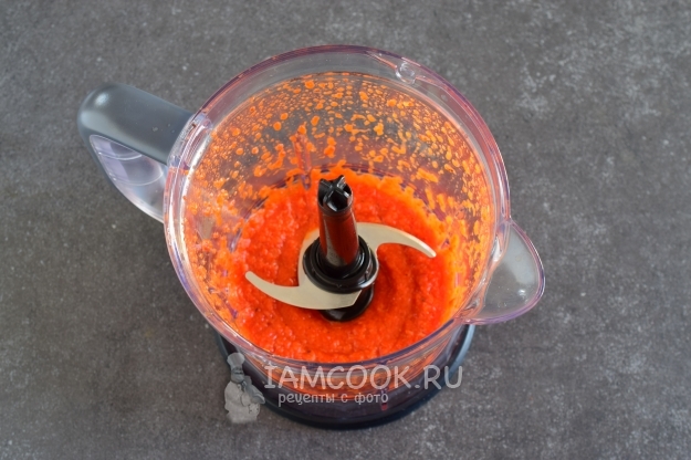 Свежий болгарский перец очистите от семян и удалите плодоножку. Пробейте в блендере кусочки перца в пюре.