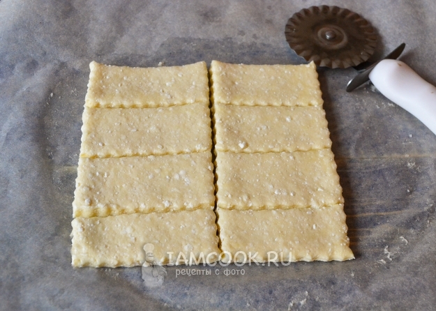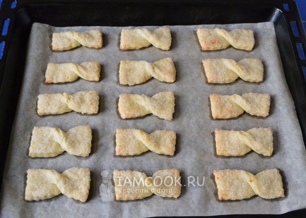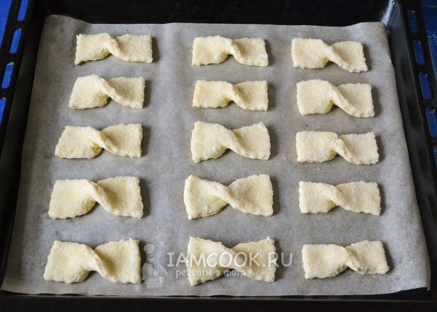 Раскладываем бантики на противне, покрытом бумагой для выпечки. Смазывать противень маслом не нужно. В творожном тесте его достаточно.