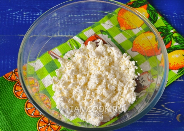 Берем деревенский творог с заметными крупинками. Можно испечь печенье из творожной массы или творожного продукта, но тогда оно получится менее «творожным» по вкусу. Перетираем творог руками до мелкой крупки.