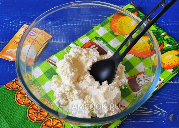 Соединяем творог с маслом и ароматным ванильным сахаром. Масса должна быть нежной, без крупных комков.