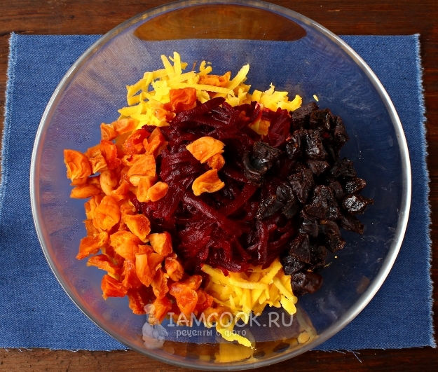 Добавляем нарезанные сухофрукты в салатник. Перемешиваем. При желании в салат можно добавить сахар или мед по вкусу.