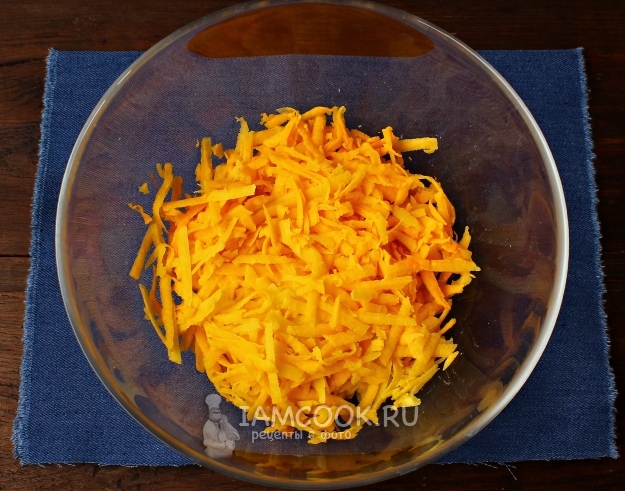 Очищаем тыкву. Тыквенную мякоть натираем на крупной терке и выкладываем в салатник.
