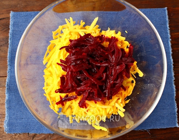 Отварную свеклу очищаем от кожуры, натираем на терке и высыпаем в салатник.