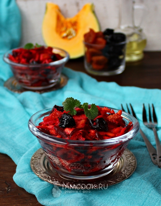 Постный салат из тыквы со свеклой и сухофруктами готов. Приятного аппетита!