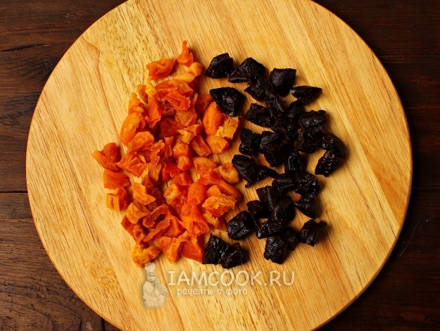 Чернослив и курагу промываем, обсушиваем и нарезаем небольшими кусочками. Если сухофрукты сухие, то их предварительно нужно замочить в горячей воде.