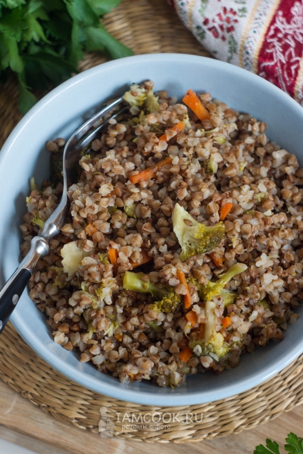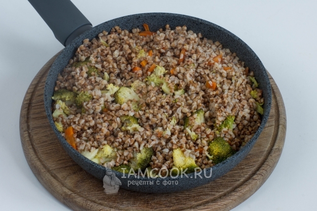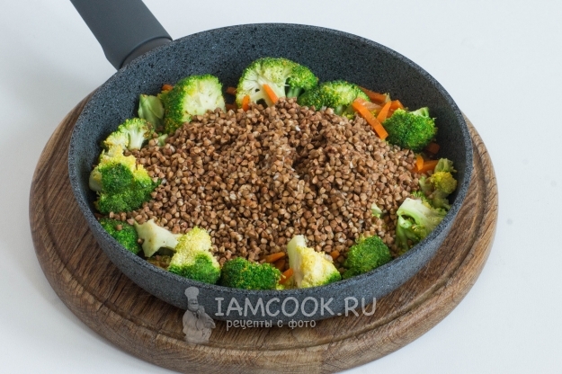 Гречневую крупу тщательно промойте и добавьте на сковородку к овощам. Залейте горячей водой, посолите и после закипания готовьте 15 минут на минимальном огне, прикрыв сковородку крышкой. Можно добавить немного воды, если покажется, что гречка суховата.