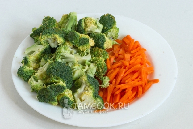 Морковь промойте, почистите и нарежьте соломкой. Брокколи промойте и разделите на соцветия.