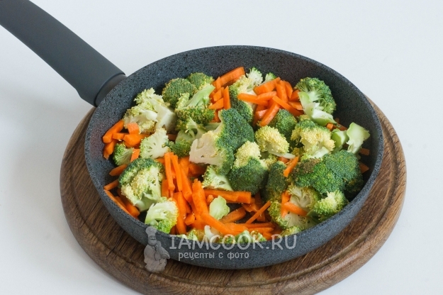 На сковородке растопите гхи, добавьте пряности, прогрейте их немного. Выложите подготовленные брокколи и морковь и слегка обжарьте их.