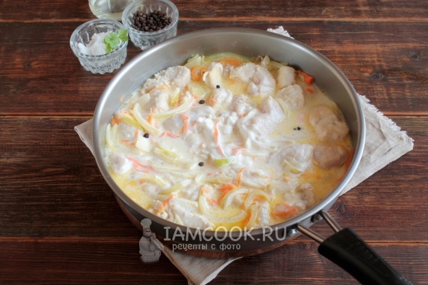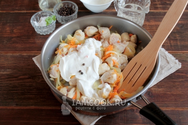 Выливаем сметану, воду, приправляем солью и черным перцем.
