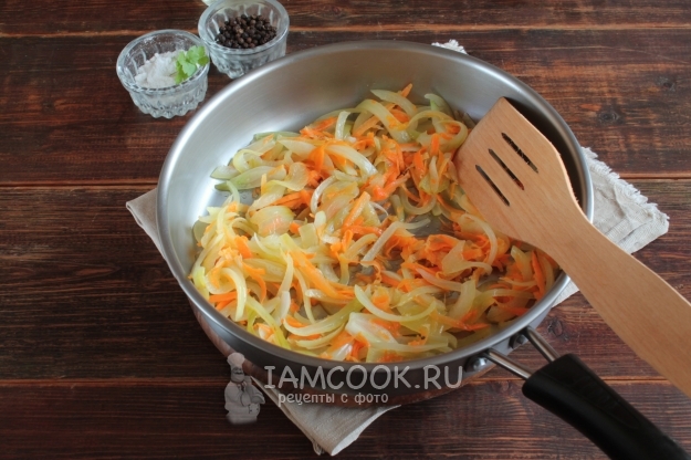 На сковороде с добавлением постного рафинированного масла минуты 3 обжариваем нашинкованный полукольцами лук, затем выкладываем натертую морковь, перемешиваем и пассеруем еще минуты 3.