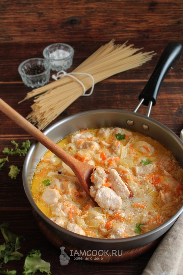 Куриная подлива на основе сметаны подходит под любой гарнир: картофельное пюре, гречневую крупу, рис, пшено, спагетти, прочие макаронные изделия и зерновые. Постная часть птицы (грудка без кости) довольно быстро размягчается, и на всю готовку уходит не более получаса. По желанию усилить аромат можно чесноком, куркумой, смесью карри, пряными травами.