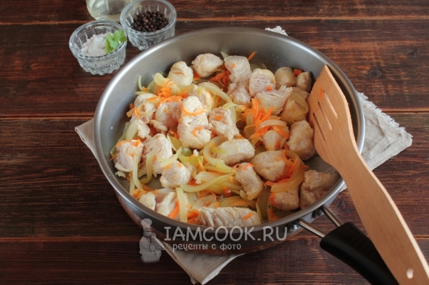 К промасленным овощам закладываем присыпанные мукой кусочки курицы. Перемешиваем и продолжаем обжаривать следующие пару минут.