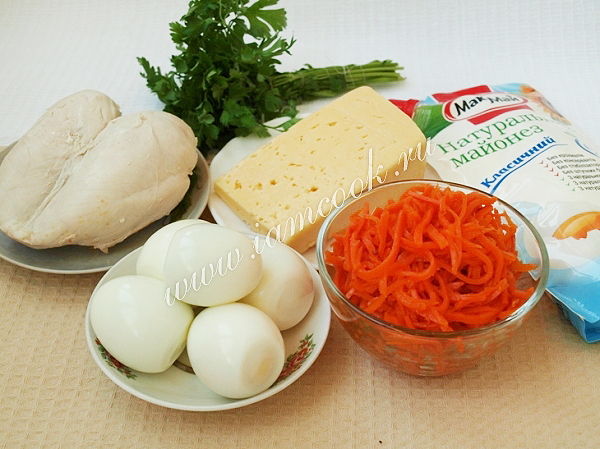 Для салата нам понадобится совсем простой набор продуктов:варёная курица, твёрдый сыр, морковь по-корейски, яйца, майонез и зелень.