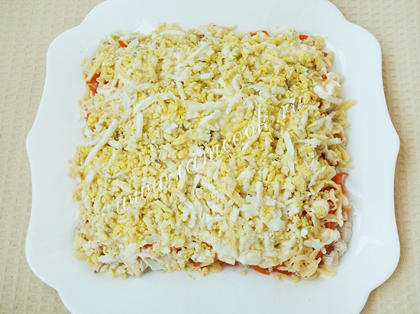 Сверх сыра сделать майонезную сетку и посыпать натёртыми яйцами.