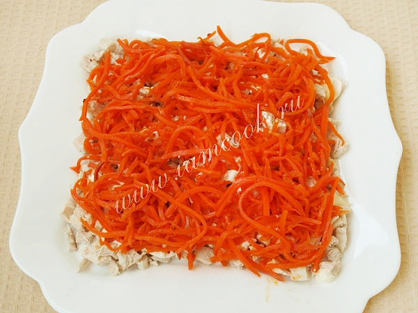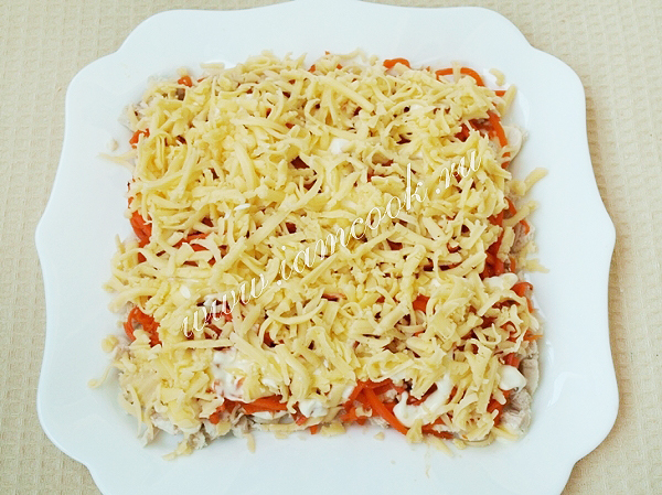 Натереть на тёрке твёрдый сыр и выложить сверху корейской морковки.
